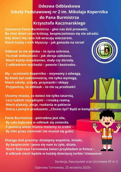 Na ostatnich zajęciach rozwijających nasi uczniowie stanęli przed wyjątkowym wyzwaniem – przygotowali „Odezwę odblaskową” do Pana Burmistrza Krzysztofa Kaczmarskiego