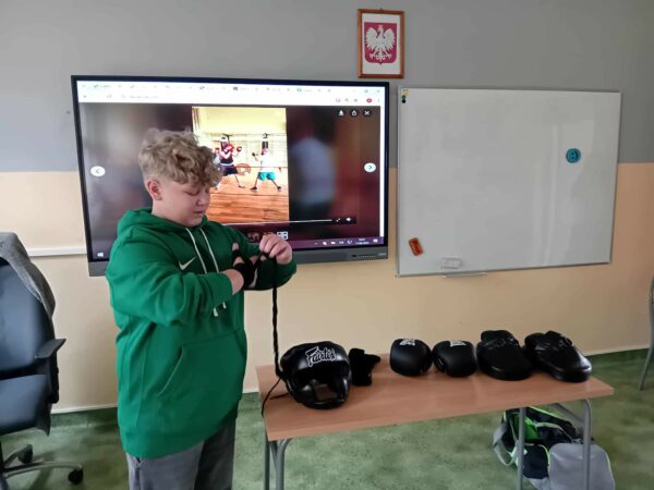 Poznajcie Kubę, ucznia klasy VIc. Kuba trenuje boks. Swoim koleżankom i kolegom opowiedział o treningach, odpowiednim stroju oraz zasadach obowiązujących podczas uprawiania tego sportu. Kuba przyniósł na zajęcia z wychowawcą elementy sportowego wyposażenia. Każdy mógł przymierzyć rękawice i spróbować wymierzyć bokserski cios w tarczę . Przy tej okazji odkryliśmy więcej bokserskich talentów w klasie, ale o tym przeczytacie w kolejnych artykułach…