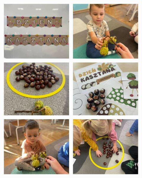 W Oddziałach Przedszkolnych zagościła jesień 🍁 a wraz z jesienią – Dzień Kasztana 🌰 Z okazji tego wyjątkowego święta przygotowaliśmy dzisiaj wiele rozmaitych aktywności. Odkrywcy i Tropiciele przynieśli mnóstwo kasztanów, które posłużyły nam podczas zajęć ✨ Pobawili się z zabawy matematyczne związane z liczeniem i segregowaniem kasztanów, zagraliśmy w kasztanowe memory, układaliśmy puzzle 🧩 dopasowując kasztanowym ludzikom główkę, tułów i nogi, zaśpiewaliśmy i zatańczyliśmy do piosenki ,,Taniec z kasztanem” ✨, wykonaliśmy pracę plastyczną z użyciem plasteliny 🎨, a także byliśmy na jesiennym spacerze w parku 🌳w poszukiwaniu kasztanów i skarbów jesieni 🌰.