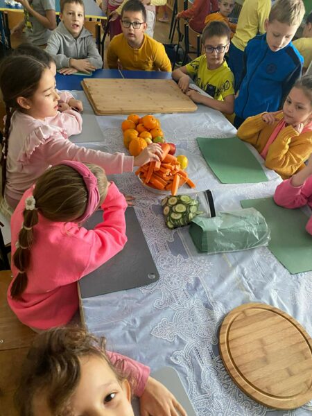 W ramach programu „Ruch i zdrowe odżywianie to moje wyzwanie”, uczniowie klasy 1a z ogromnym entuzjazmem wzięli udział w kreatywnych warsztatach kulinarnych. Tym razem przygotowali deski warzywno-owocowe, samodzielnie krojąc i układając różnorodne produkty w ciekawe kompozycje. Jak wiadomo, jemy nie tylko ustami, ale i oczami – kolorowe deski pobudzały wszystkie zmysły i zachęcały do spróbowania nowych smaków.