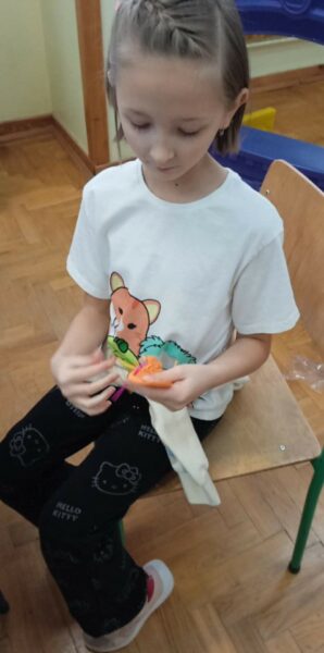 Tym razem dzieci miały możliwość pracy z filcem, tworząc kolorowe swoje pierwsze pluszowe maskotki-breloki do plecaka czy piórnika, które mogły zabrać do domu.Mali uczestnicy zajęć korzystali z gotowych,filcowych elementów, które samodzielnie łączyli za pomocą nitek, igieł,🪡🪡🪡oraz dodatków dekoracyjnych.Z bardzo dużym zaangażowaniem dobierały kolory, kształty i ozdoby, rozwijając przy tym swoją kreatywność, wyobraźnię, koordynację ręką -oko oraz zdolności manualne ćwicząc pewność siebie.Każde dziecko po tych zajęciach może powiedzieć,, Zrobiłem to sam”.To wielki sukces zrobiony małymi rączkami.
