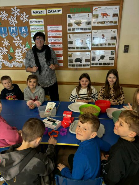 Podczas zajęć dzieci przygotowały dla ptaków pyszne jedzonko – ziarniste gwiazdki. Z wielkim zaangażowaniem i radością zawiesiły je na drzewkach w pobliżu świetlicy, tworząc prawdziwe ptasie stołówki.