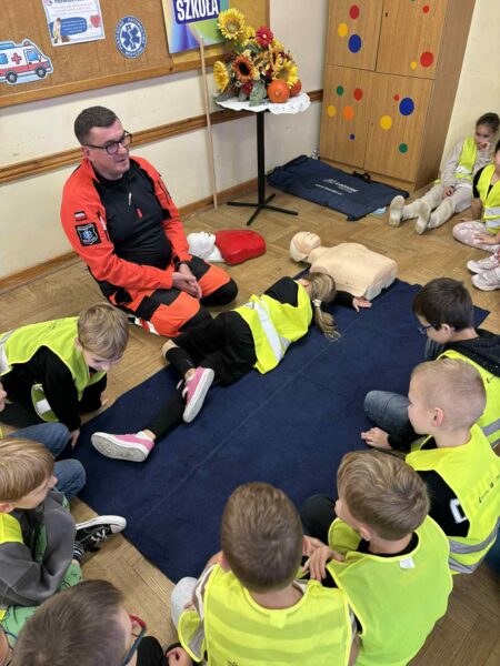 Podczas zajęć dzieci dowiedziały się, jak prawidłowo udzielać pierwszej pomocy, a także przypomniały sobie, jak ważne jest noszenie elementów odblaskowych dla własnego bezpieczeństwa.