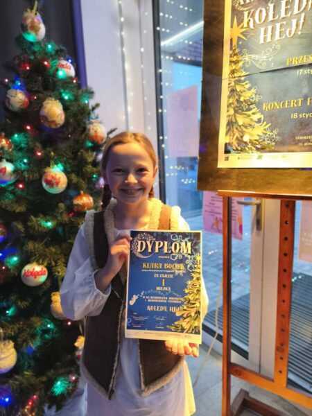 Z ogromną radością informujemy o sukcesie naszej uczennicy w Regionalnym Festiwalu „Kolęda Hej”. Klara Bociek uczennica kl. 4b zdobyła I miejsce w kategorii klas I–IV, wykazując się wyjątkowym talentem oraz wysokim poziomem artystycznym. Występ Klary, zaprezentowany wśród licznej i wymagającej konkurencji, został nagrodzony najwyższym uznaniem jury. Serdecznie gratulujemy laureatce i życzymy dalszych sukcesów oraz rozwijania pasji muzycznych.