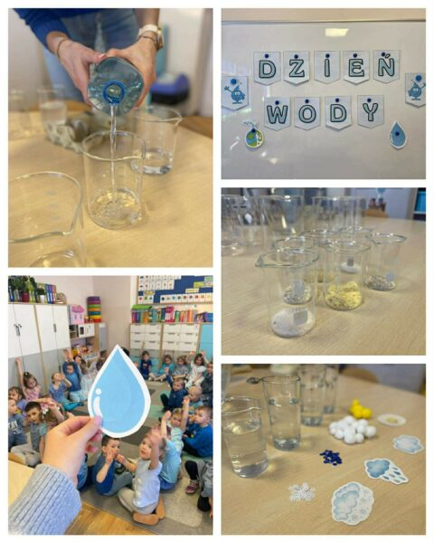 . Pani Bernadka wprowadziła dzieci w świat wodnych eksperymentów, gdzie każde z nich mogło doświadczyć na własnych rękach co takiego dzieje się z wodą, gdy wsypiemy do niej np. sól, cukier czy makaron. Sprawdziliśmy które przedmioty toną, a które utrzymują się na powierzchni wody. Zobaczyliśmy, że jajko potrafi unosić się na wodzie, gdy wsypiemy odpowiednią ilość soli do naczynia z wodą. Wykonaliśmy kilka doświadczeń, zadanie ,,pogoda w szklance”, a także pracę plastyczną – kolorowankę – kroplę wody ![]()