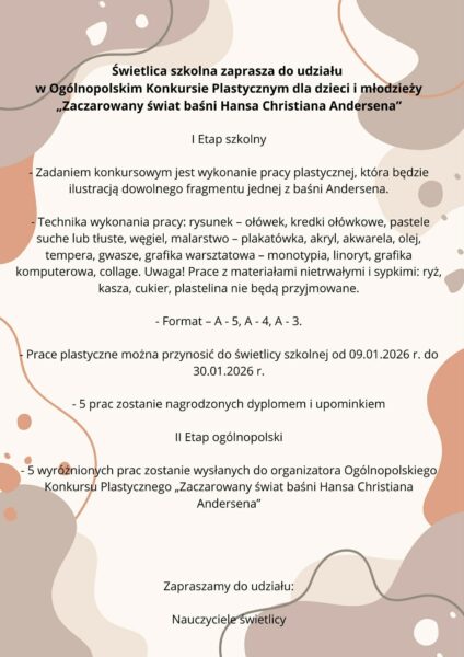 Świetlica szkolna zaprasza do udziału w Ogólnopolskim Konkursie Plastycznym dla dzieci i młodzieży „Zaczarowany świat baśni Hansa Christiana Andersena”