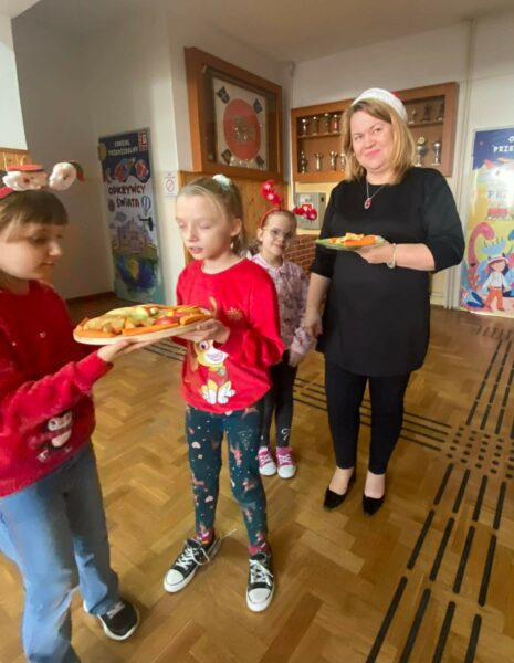 Nie tylko uczniowie mieli okazję spróbować zdrowych smakołyków – sam Mikołaj również skosztował warzywnych talerzyków! Podczas tak intensywnego dnia pracy dodatkowa porcja witamin była mu zdecydowanie potrzebna. Pani Dyrektor także spróbowała przekąsek i podkreśliła, jak ważne są warzywa w codziennej diecie.