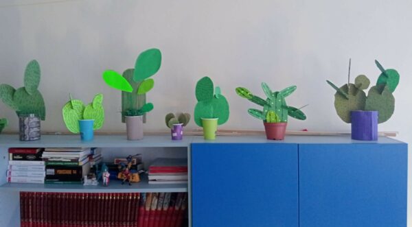 W ostatnim czasie można było świętować Dzień Ziemi oraz Światowy Dzień Recyklingu. Z tej okazji na lekcjach plastyki klasy czwarte wykonały z kubeczków i tektury wieczne kaktusy, żeby ozdobić na zielono klasę P3 i żeby pan od plastyki nie musiał pamiętać o podlewaniu.